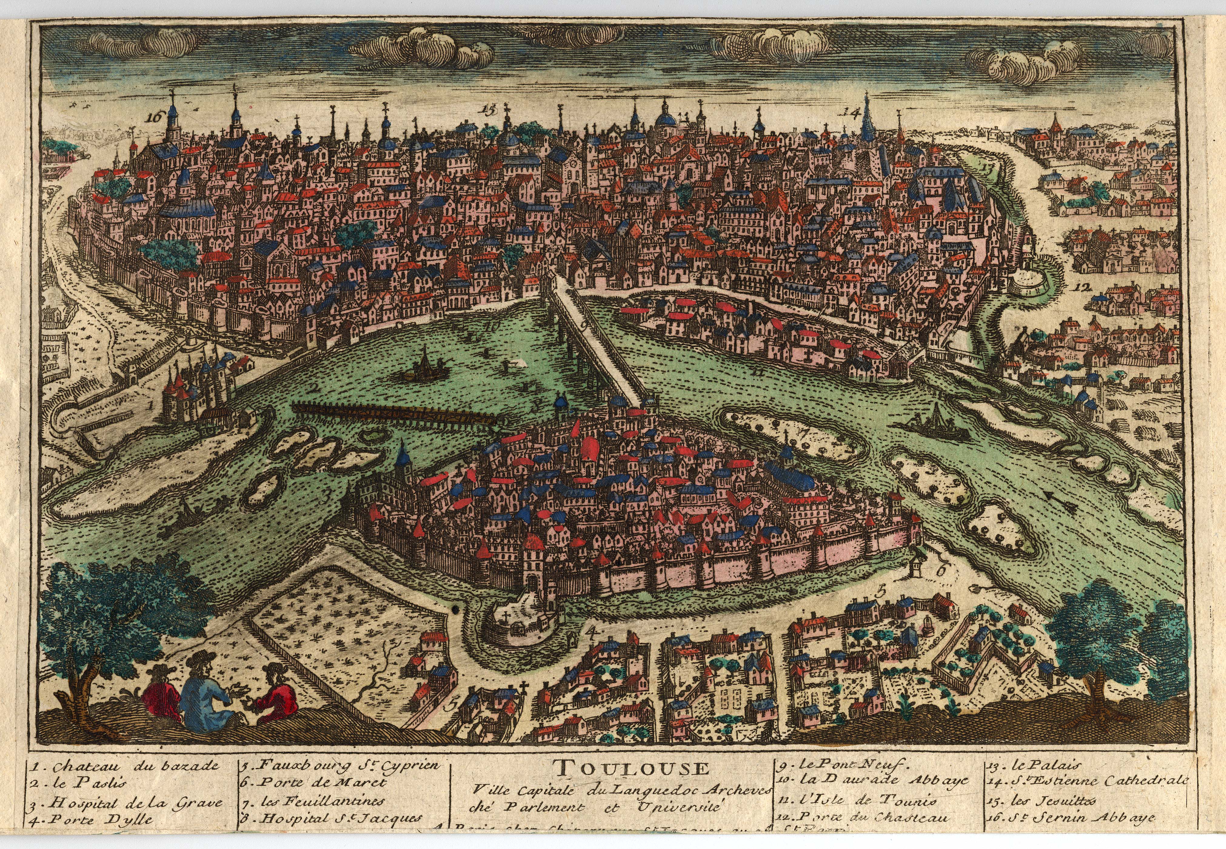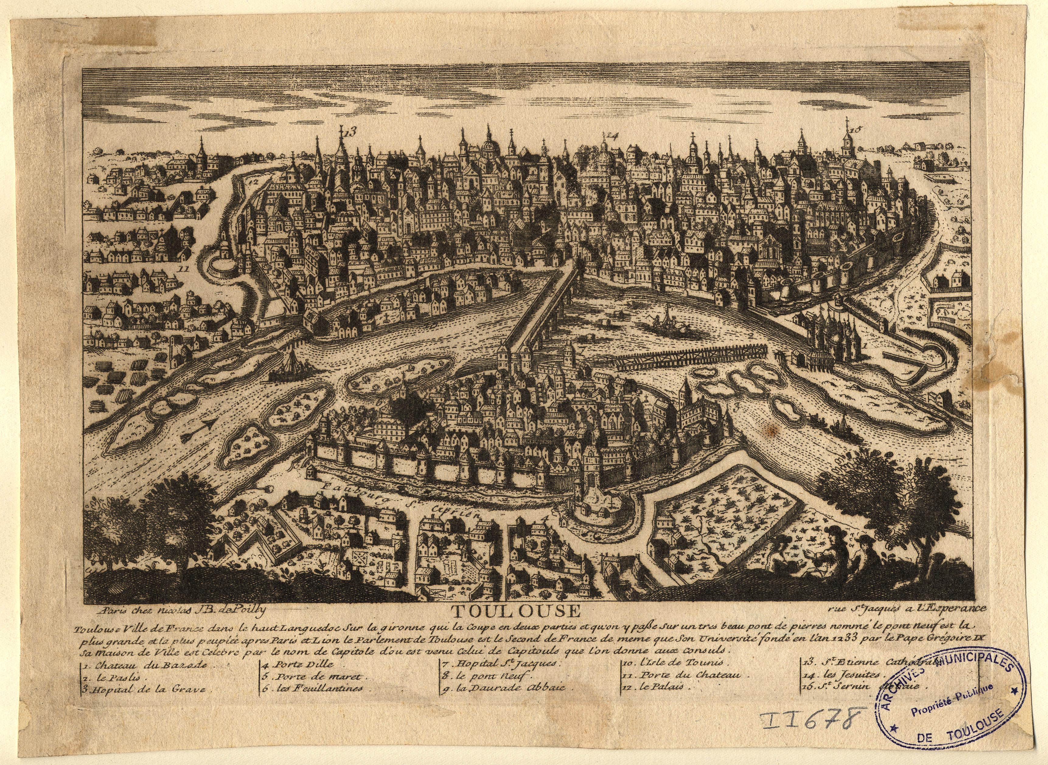 Ces deux gravures quasi-identiques posent des problèmes de datation et d'auteur. C'est une vue cavalière de la ville de Toulouse.