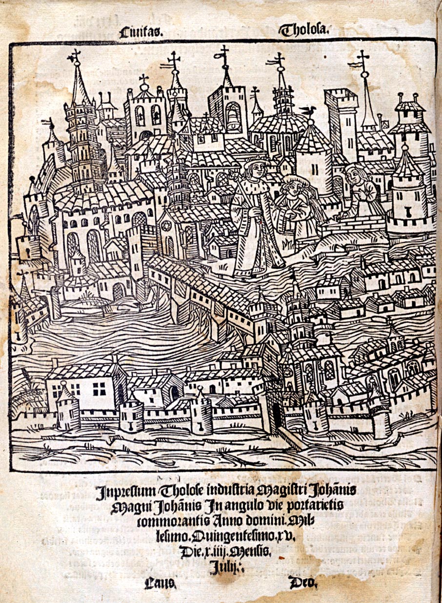 Cette gravure sur bois illustre l'ouvrage Gesta Tholosanorum écrit en 1515 par Nicolas Bertrand. Il s'agit d'une vue cavalière de la ville de Toulouse.
