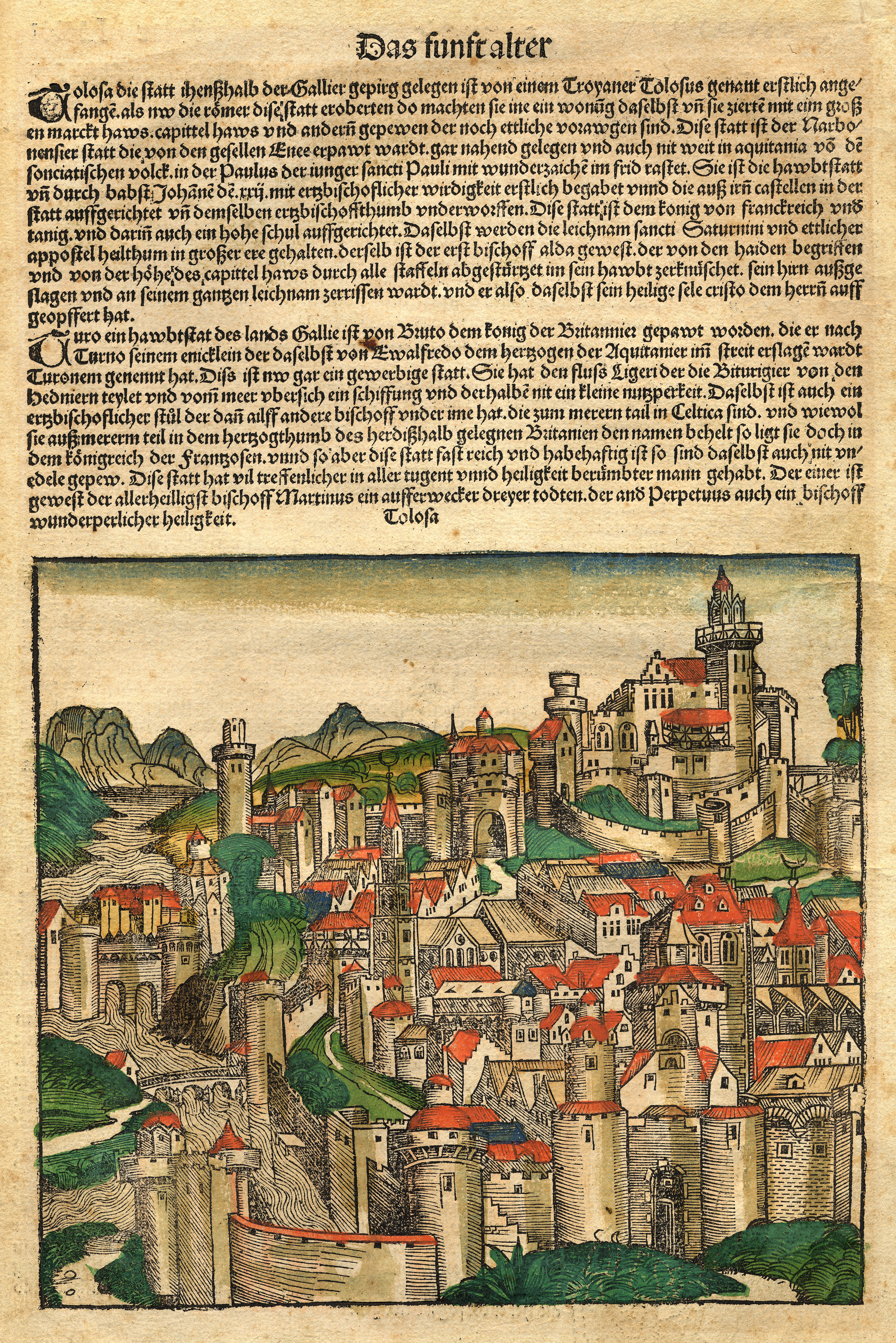 Sur cette représentation de la ville de Toulouse des détails font penser à une ville orientale (ex : le croissant de lune sur les clochers). Hartmann Schedel a utilisé la même gravure pour décrire plusieurs villes. Nous sommes donc en présence d'un document qui ne représente pas de façon réaliste cette ville à la fin du XVe siècle.