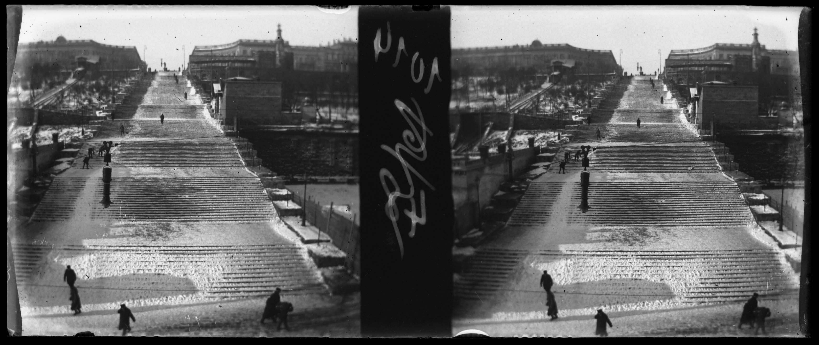 Attendez, pas la peine de vous essouffler en grimpant à toute allure ces 142 mètres qui s’étendent entre ces deux différents récits d’une seule et même histoire. Prenons tout de même un peu de temps pour faire une pause, et arrêtons-nous sur un des neuf paliers intermédiaires pour écouter celle de Louis Albinet, l’auteur de cette vue stéréoscopique sur plaque de verre. Au cours de la Première Guerre mondiale, le photographe est mobilisé sur le front d’Orient et intègre le Service Archéologique de l’Armée d’Orient. Dans ce cadre, il produit une importante quantité de clichés et nous fait voyager en Grèce, allant de Salonique à Delphes, puis en Turquie, pour terminer sa course, en mars 1919, dans la ville d’Odessa. Peu avant son retour en France, il nous dévoile l’atmosphère hivernale de cette ville et arpente ses avenues enneigées. Situé en contrebas de cette enfilade interminable de marches, il double de quelques années le réalisateur russe, et révèle cet ouvrage architectural qui deviendra, des décennies plus tard, si célèbre.