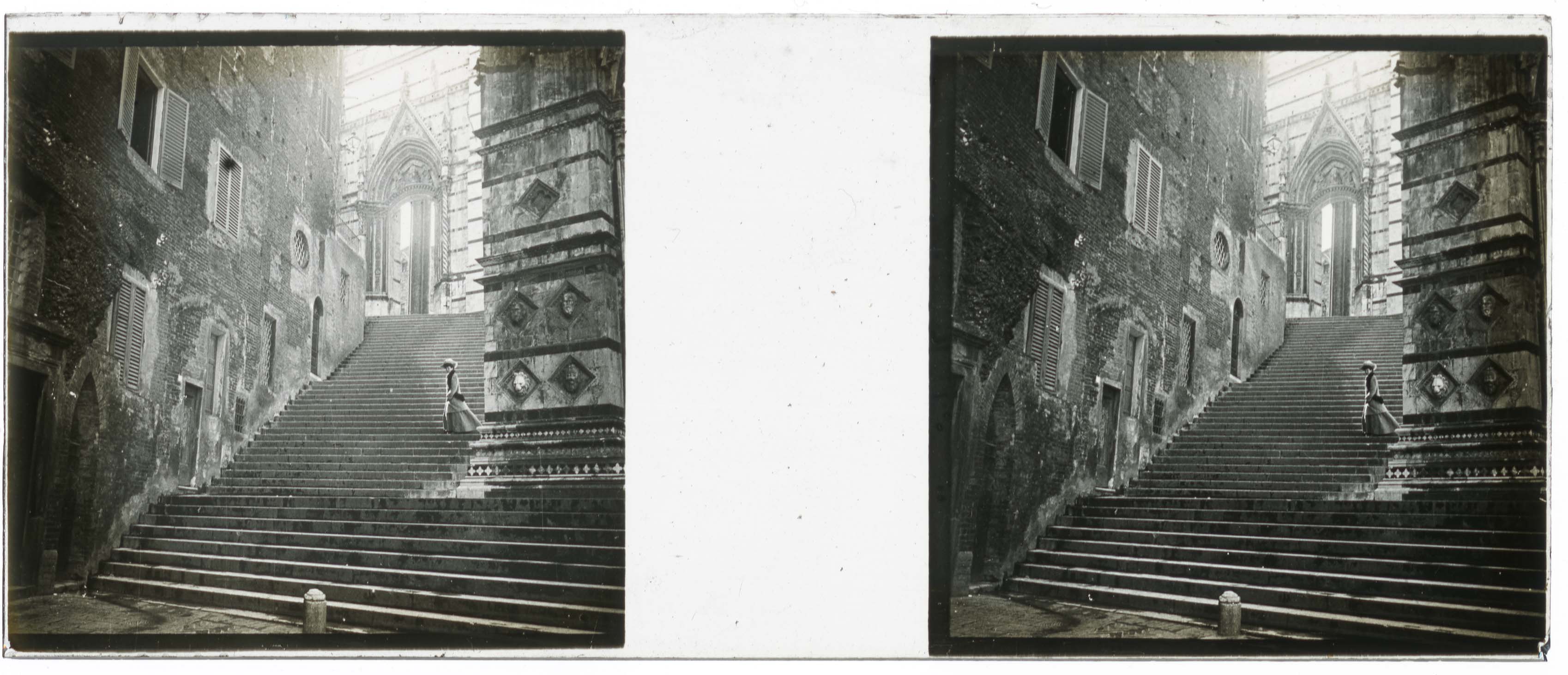 Croyez-le ou non, les escaliers ont bien des histoires à nous raconter. Je ne peux d’ailleurs pas m’empêcher de terminer cet article par une de mes dernières trouvailles, encore signée de la main de Monsieur Albinet. Il nous emporte avec lui à Sienne, en Italie, en compagnie de sa très chère épouse. Qui sait, peut-être que cet escalier fort photogénique, mis en valeur par les douces lumières des vacances, ainsi que la pose de Juliette Albinet vous évoqueront quelques belles histoires et raviveront les scènes les plus marquantes issues de vos films ou séries favoris.