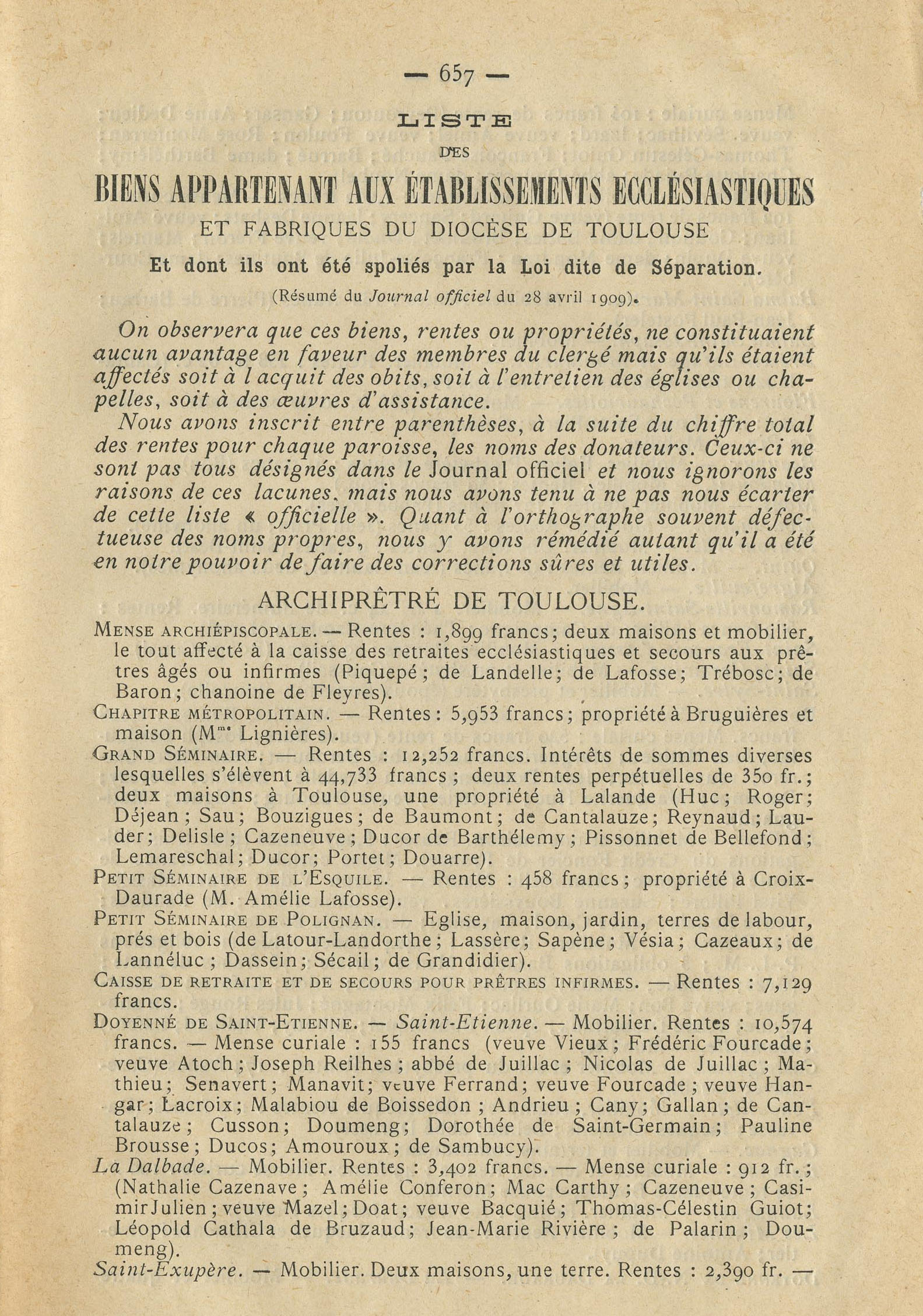 « Liste des biens appartenant aux établissements et fabriques du diocèse de Toulouse », extraits de la Semaine catholique de Toulouse, dimanche 4 juillet 1909. Ville de Toulouse, Archives municipales, REV252 page 657.« Liste des biens appartenant aux établissements et fabriques du diocèse de Toulouse », extraits de La Semaine catholique de Toulouse, dimanche 4 juillet 1909. Ville de Toulouse, Archives municipales, REV252 page 657.
