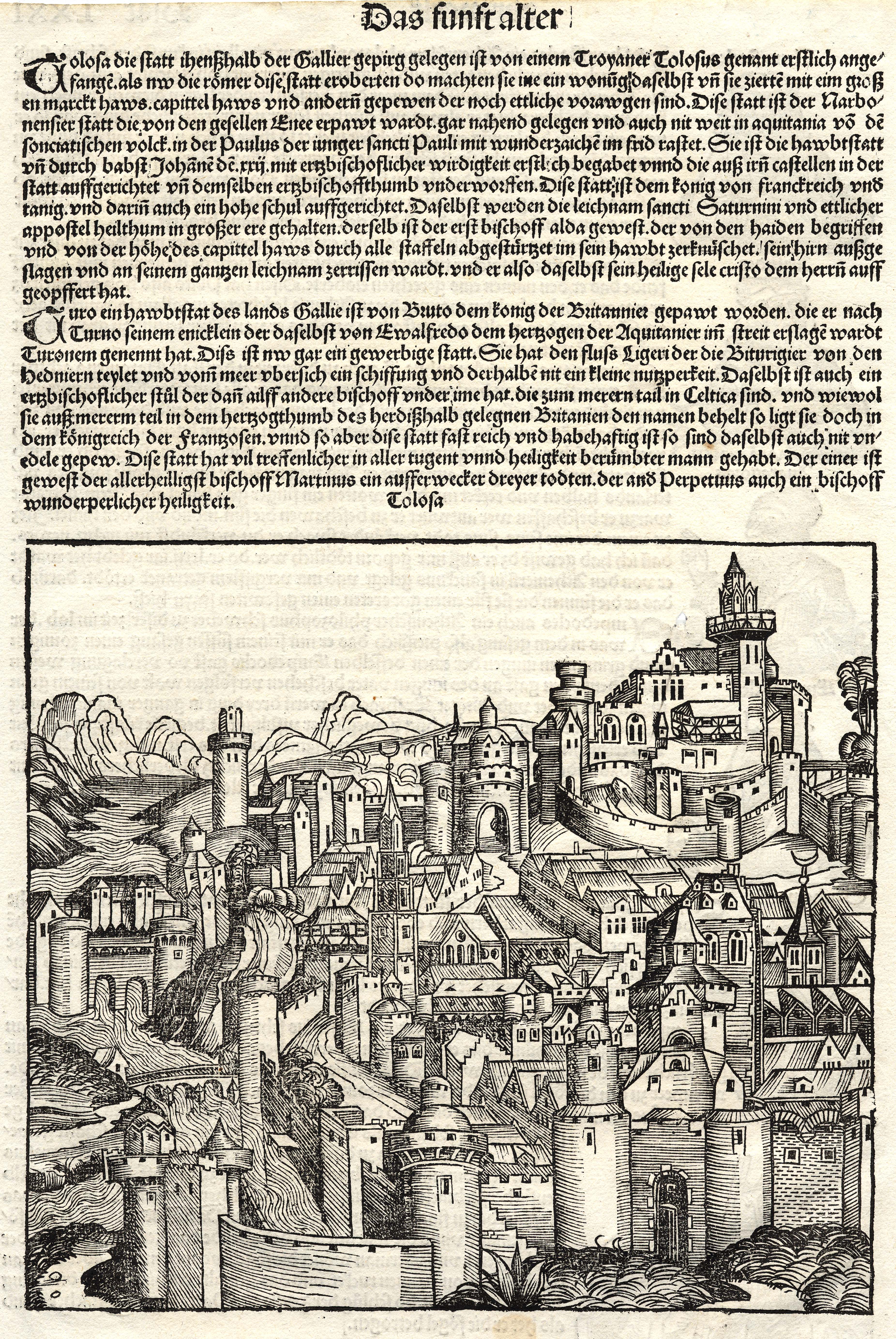 Sur cette représentation de la ville de Toulouse des détails font penser à une ville orientale (ex : le croissant de lune sur les clochers). Hartmann Schedel a utilisé la même gravure pour décrire plusieurs villes. Nous sommes donc en présence d'un document qui ne représente pas de façon réaliste cette ville à la fin du XVe siècle.