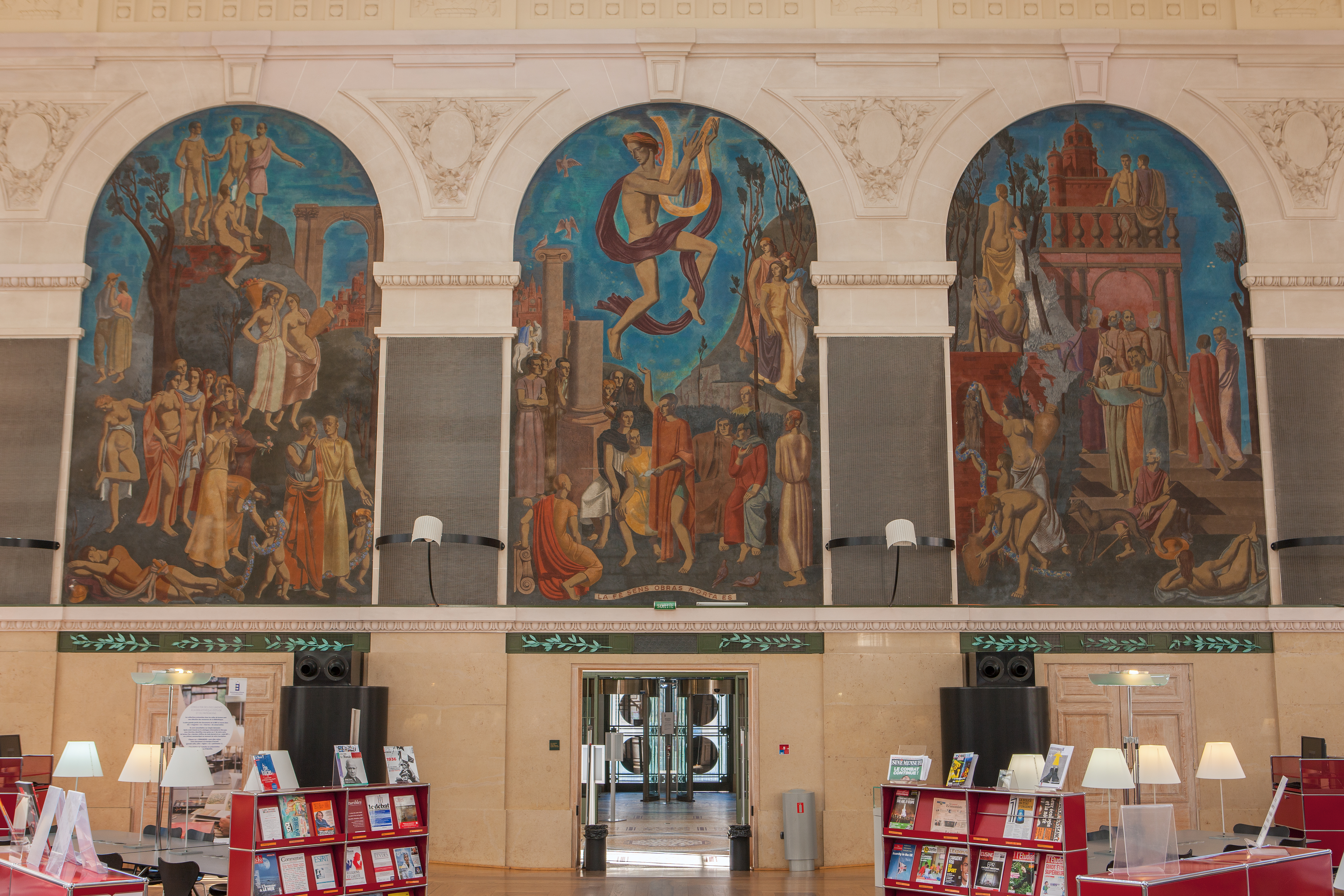 Marc Saint-Saëns L'artiste s'est représenté, en retrait, partiellement dissimulé derrière une colonne, spectateur de la scène qui se déroule devant lui. Pierre Frayssinet et Pol Neveu Frayssinet, poète et ami de Saint-Saëns, mort très jeune, déclame ses vers au centre d'une assemblée attentive, composée de poètes méridionaux mais où figure également Pol Neveu (assis, se tenant la tête), l'inspecteur général des Bibliothèques en charge du projet toulousain. Jean Giraudoux En peignant la figure de Jean Giraudoux, écrivain de grande renommée, Saint-Saëns remercie avant tout l'homme qui l'a aidé à faire publier les poèmes de son ami Pierre Frayssinet en 1931. |