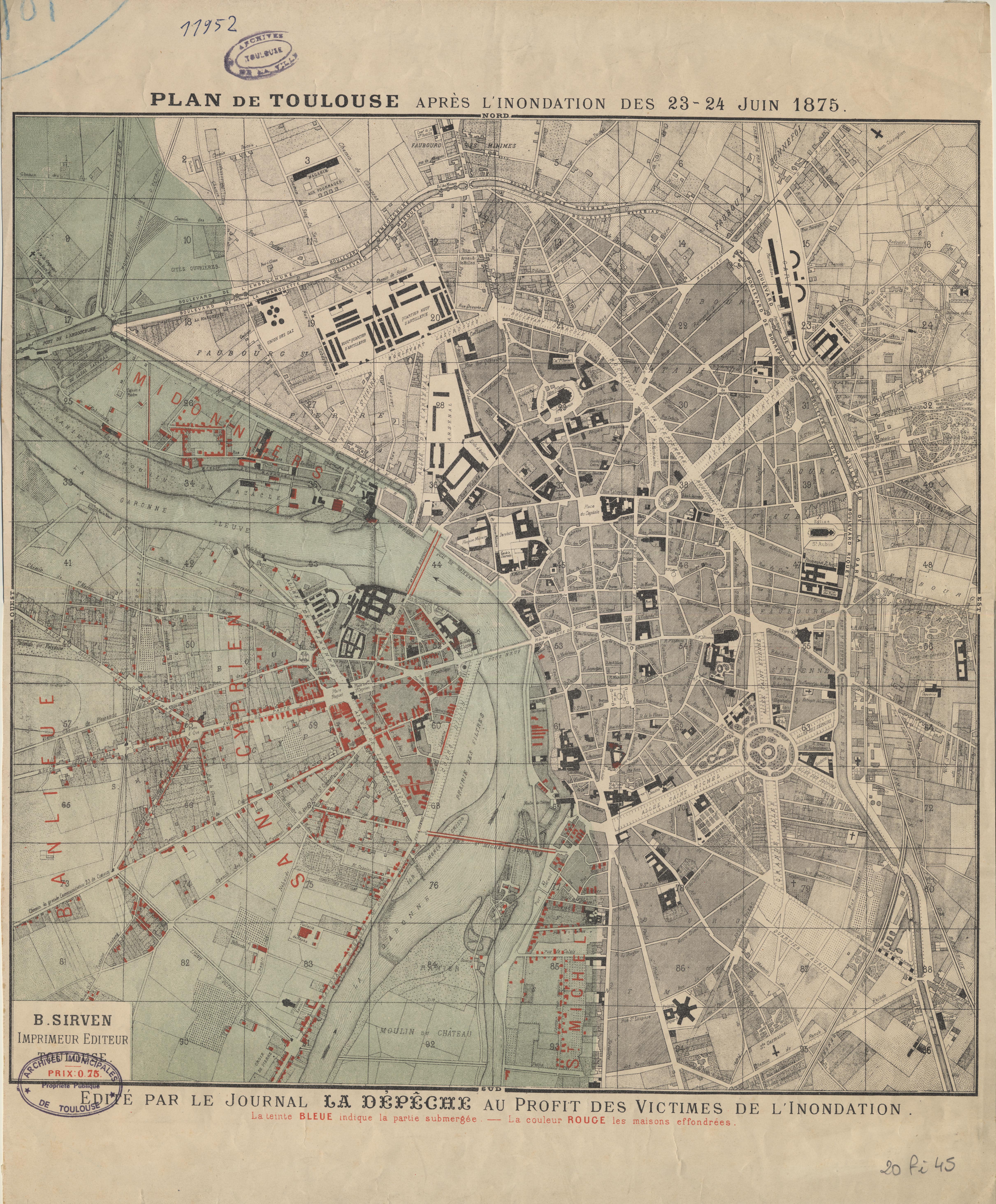 [Inondations des 23 et 24 Juin 1875] Plan de la ville de Toulouse dressé après les inondations des 23 et 24 Juin 1875, à l'aide du grand plan de Toulouse édité par la maison H. Labouche. En couleurs, avec indications de la partie submergée et des maisons effondrées. Ce plan a été publié dans la brochure intitulée "Les inondations de 1875 dans le Sud-Ouest. Toulouse, Castelsarrasin, Moissac, Agen, etc." éditée par la Dépêche du Midi au profit des victimes de l'inondation.