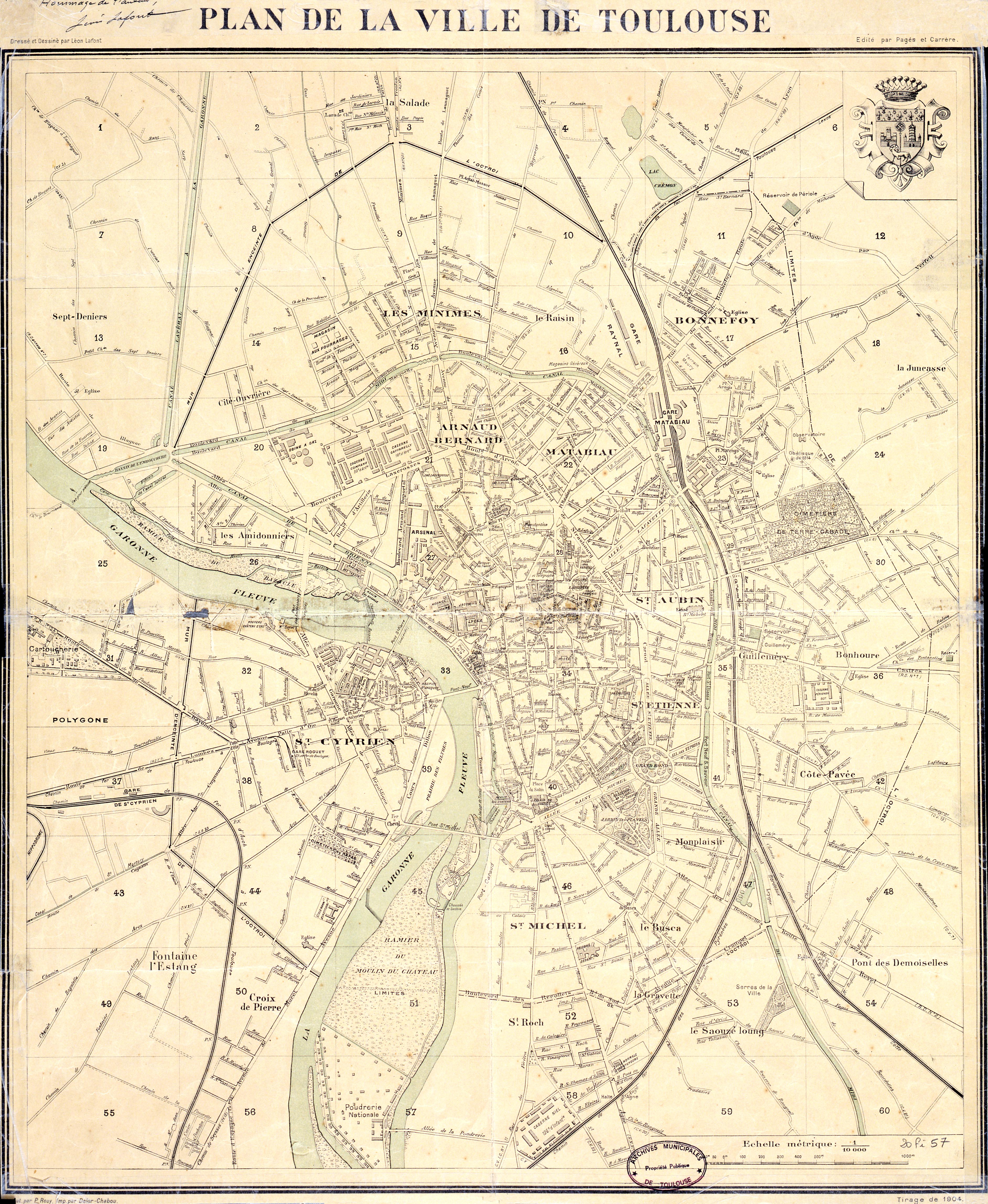 Plan de la ville de Toulouse Plan de la partie centrale et urbanisée de la commune de Toulouse. 1904. Signature autographe de Léon Laffont dans le coin supérieur gauche. Armes de la ville dans le coin supérieur droit.
