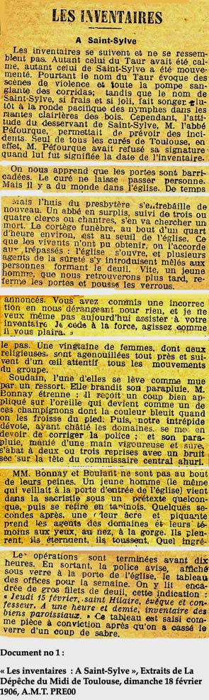 Les deux premiers portent sur les conditions dans lesquelles se passent les inventaires de la basilique Saint-Sernin et de l'église Saint-Sylve. L'inventaire de Saint-Sylve, donne lieu, dans la matinée du 15 février 1906, à des mouvements de résistance, et des incidents. Ces protestations font suite à l'encyclique Vehementer nos du pape Pie X le 11 février 1906, dans laquelle il condamne le principe de la séparation, et encourage les catholiques français à s'opposer aux inventaires des biens ecclésiastiques. Les personnes en présence sont : l'abbé Péfourque et d'autres religieux de l'église Saint-Sylve ; les représentants de l'Etat chargés de l'inventaire : le commissaire central des Domaines, M. Lieux et ses sous-inspecteurs, dont M. Bonnay, et les forces de l'Ordre ; ainsi que des catholiques, dont Mme Jacquette Bénabent. Quant à celui de Saint-Sernin, il entraîne quelques jours plus tard une mobilisation importante de forces de l'ordre.